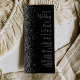 The left-hand edge of this elegant modern wedding program features a silver faux glitter design. The customisable text combines silver grey handwriting, copperplate and italic fonts on a black background.