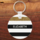 Personalise this modern wide horizontal black and white stripes pattern keychain with a gold glitter stripe by adding the name of any girly girl. This trendy graphic striped pattern is perfect for the chic fashionista. Flat printed image, NOT actual glitter.