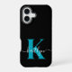 This simple, elegant black iPhone 16 Case with your first name in a trendy script font in white typed over your first initial in a modern cap font in teal would look fabulous on your cell phone and will keep it protected from breakage. It's stylish and trendy and yet very classic.