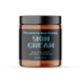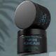 A modern black cosmetics jar label with blue and grey text with space for your business name, social media handle, website, mailing address and phone number.