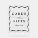 Add a stylish touch to your wedding, bridal shower, baby shower, graduation party, or other special event with this Modern Black Wavy Frame cards and gifts sign. The design features "Cards and Gifts" in bold black lettering surrounded by a black wavy border with a clear background. Personalise the retro cards and gifts acrylic sign with your custom text below. Please note: The wooden stand in the product mockup photo does not come with the sign. Zazzle sells a similar wood block for an additional cost.