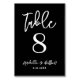 This custom table number sign features a simple black and white design with a clean black background and crisp white fonts for a timeless look. A mix of handwritten script and classic serif fonts creates an elegant and balanced style. The design includes the table number, along with the bride and groom’s names and wedding date.
