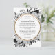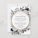 Black and white watercolor florals of hydrangeas, eucalyptus and peonies with faux gold circular border (optional). All text is customisable, as well as the backer pattern.