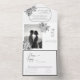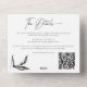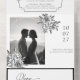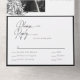 A modern black and white wedding all in one wedding invitation with wedding details, QR code for website and a rip-off RSVP card. Delicate hand-drawn peonies adorn the corners, adding a touch of floral elegance without the use of colour. This modern, monochrome design creates an timeless look. Add your own black and white photo or try the filter option in design tool. A white art deco–inspired frame highlights photo and frames the text. Some word are this elegant calligraphy cripts to add a handwritten feeling.