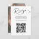 This modern RSVP card brings together elegance and convenience with clean, contemporary typography on a crisp white background. A dedicated QR code section allows guests to swiftly access your wedding website or RSVP information, simplifying the response process. The reverse side offers a personal touch with space for your photo and monogram, adding a unique, memorable detail. Fully customisable, this sleek design blends minimalism with sophistication, ensuring it complements any wedding style while helping you gather responses with ease and style.