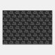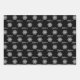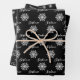 Modern gift wrap set features three coordinating wrapping paper sheets: white snowflake with name, white script "Merry Christmas" text, and white winter snowflakes pattern on a black background. You can easily change the black background color. Matching items available in our store.