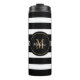 Modern Black White Stripes Script Monogram Name Thermal Tumbler