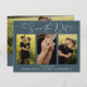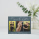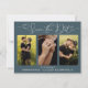 Modern boho blue 4 photos of couple Wedding Save the Date announcement card template with website information and cute heart in script font.