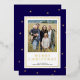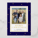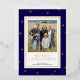 Celebrate elegant Christmas sparkle by sending the Modern Blue and Gold Foil Christmas Photo Card this holiday season. The single photo holiday card features a rich dark blue background, beautifully arranged gold foil dots and a luxe gold Merry Christmas to make your greeting shine. Your photo is delightfully framed within a contrasting white rectangle, bordered in a gold foil stroke. The back of the card finishes the classic look with the dark blue background. A perfect card for those who love minimalism combined with a touch of luxury.