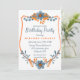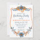 Add your birthday party details to this modern frame of orange a blu grey flowers.