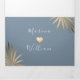 Simple, modern, tropical, summer dusty blue 3 in 1 beach wedding tri-fold invitation, with gold palm leaves and picture of the couple.