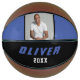 Modern Blue Black Custom Name Text Photo Basketball. Black and blue background with blue and white text. Personalise it with your photo, name and the year - you can change any text on the basketball or erase it. A perfect gift for a basketball player, coach, friends and family. Great keepsake to remember your favourite sport.