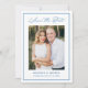 Announce your wedding with this modern photo wedding save the date featuring “Save the Date” in blue calligraphy script at the top and a coordinating blue border framing the design. Your vertical photo is displayed at the center, with your names, wedding date, and location shown below in clean, easy-to-read lettering. This modern wedding save the date is perfect for coastal weddings, beach weddings, summer weddings, and destination weddings. The back is blank, allowing space for a wedding website and additional photos.