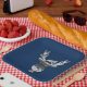 Elegant Faux Silver Grey Reindeer wearing Santa Hat and Christmas Bell on Corporate Blue Background, Stylish Christmas Party Paper Plates