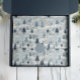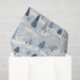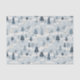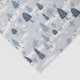 A modern, soft snowy blue and cream Christmas village pattern dotted with small, detailed houses and monochromatic blue trees.