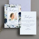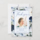 This is a modern and elegant blue floral celebration of life thank you card. The design features a beautiful calligraphy font and watercolor blue and white florals and a personalised photo. This thank you card can easily be personalised to create a special tribute for your loved one using the template provided. Please contact the designer for any queries regarding this design or for any matching products.