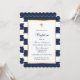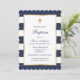 Elegant blue and white striped baptism invitation showcasing a gold cross, a frame and little stars.