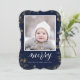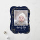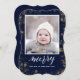 Send customisable and personalised holiday greetings to friends, colleagues and family in simple, minimalist, elegant, fun, festive and modern photo cards! A beautiful frame of variety of gold new year confetti dots on navy blue background surrounds your photo on bracket shape paper. The greeting " MERRY " is written in elegant calligraphy, and below features your custom greeting message from your family name in modern typography. Reverse to reveal a beautiful navy blue pattern background.