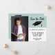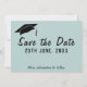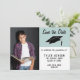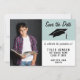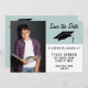 Modern Blue Graduation Save the Date Photo Announcement Card. Modern save the date card for announcing the graduation party for your graduate. The card is in blue and white and includes a graduation cap. The design has trendy text - customise all the text on the card with your data, and a photo template - insert the graduate`s photo into the template. Change the date and other text on the back side of the card.