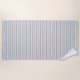 This modern beach towel features a trendy small chevron pattern in blue and grey on a white background.
