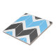 This ceramic tile features a modern herringbone pattern in blue, dark grey, and white.