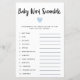 Modern and simple boy baby shower baby word scramble card featuring a blue heart. The list of words on this card are all related to babies and they are scrambled. The guests are going to compete who can unscramble all of them first! ANSWER KEY: 1. car seat 2. milk 3. playpen 4. pacifier 5. diaper 6. rocking chair 7. nursery 8. baby monitor 9. swaddle 10. formula 11. rubber ducky 12. stroller.