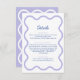 This wedding Details card is feature a wavy border. It uses calm colours like lavender inspired by lavender fields. The fun and stylish fonts add a touch of elegance, and some words are highlighted in bright blue for a fun pop of colour.
