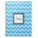 Personalised white and blue chevron pattern spiral notebook with a name in black and monogram in matching blue shade.