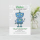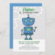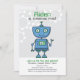 Blue robot birthday party invitations. Colours include green, blue and grey.