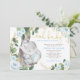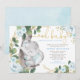 This modern baby shower invitation features beautiful light blue roses, elegant greenery and an adorable sleeping baby elephant.