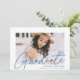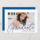 Invite guests to celebrate the graduation with our modern photo graduation party invites. The trendy graduation party invites feature the graduate's photo with "Graduate" in a blue modern calligraphy script overlay. Personalize the front of the invites by adding the graduate's name, school name, and graduation year. The invite reverses to display your graduation party details and a trendy blue and white dotted geometric pattern.