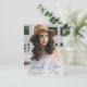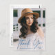 Modern photo graduation thank you postcard featuring the graduate's vertical photo with "thank you" in a handwritten blue calligraphy script overlay. Personalise the front of the graduation thank you postcard by adding the graduate's name and graduation year. The photo thank you postcard reverses to display your return address and custom message.