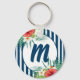 Modern Blue Stripes and Flowers Monogram Key Ring