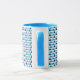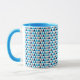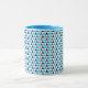 This colourful coffee mug features a cute geometric pattern with white, grey, and blue triangles.