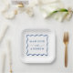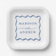 Add a stylish touch to your wedding reception, rehearsal dinner, engagement party, or wedding shower with these Modern Blue Wavy Frame paper plates. The retro wedding paper plates display the couple's names in bold blue lettering surrounded by a blue wavy border contrasting with a white background. The trendy wedding paper plates were designed to coordinate with our Modern Wavy Frame wedding collection.