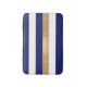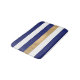 Chic bath mat done in a contemporary bold striped pattern, in blue, white and gold tone. Matching bathroom products are available. Comes in three sizes.