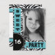 A very modern and stylish black and white zebra pattern design that works well with black and white photographs of your daughter celebrating her sweet sixteenth birthday! High contrast or selective colour photos would also look sharp! This design features bold electric blue colour bands, large block letter text and wild zebra print pattern to draw attention to the most important part of the page - your sweet 16er! Invite all of her girl friends to a special sweet 16 celebration with this pretty feminine, high fashion and trendy card. . It has several easy to customise text areas on the reverse side for your birthday girl's name and all sleepover or celebration party details, as well as rsvp contact information. Click the handy customise button to resize/reposition your photo if necessary and ensure that it covers the entire photo area.
