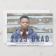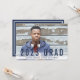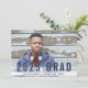 Modern blue and white graduation photo announcement or party invitation features your landscape orientated senior photo on the front, with "201X Grad" in navy blue typeface and transparent white overlay stripes displaying the graduate's name and school. Add your party details to the back in matching navy and white; or, clear the back text to use as a simple graduation announcement.