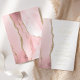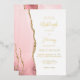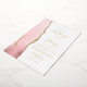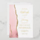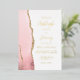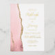 The left-hand edge of this elegant modern wedding invitation features a blush pink watercolor agate border trimmed with faux gold glitter. The customisable text combines handwriting, copperplate and italic fonts in real gold foil on a white background. The reverse side features a matching blush and gold agate design.