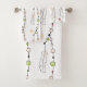 Fun and trendy design features Boho style strings of beads and feathers pattern in muted tones on white background