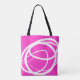 This cool boho tote bag features a simple while attractive design, composed by a playing white line that makes a different draw on each side: one is very fine in circular shapes and the other is thicker, generating an irregular expressive triangle. The background is fuchsia.