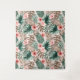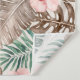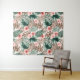 Cool tropical tapestry design featuring monstera, banana and palm leaves watercolor illustrations together with pink hibiscus flowers on a cream coloured background.