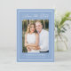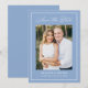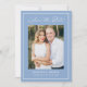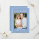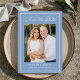 Share your wedding date with this modern photo wedding save the date featuring a soft blue background, white calligraphy script, and a matching white border that frames the design. Your vertical photo is centered, with your names, wedding date, and location displayed below in clean, easy-to-read lettering. This simple wedding save the date is ideal for coastal weddings, beach weddings, summer weddings, and destination weddings. The back is blank, giving you space to include a wedding website and additional photos.