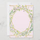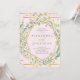 This elegant wedding invitation features a modern, faux gold look geometric frame with a trendy green leaf-filled wreath on a blush pink background.