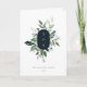 Elegant watercolor botanical greenery frame, holiday photo card. Design features, modern dark blue framed "JOY", template text lines for your family name, message, names and year. Solid coordinating dark blue color panel with white framed photo space inside.