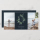 Elegant watercolor botanical greenery frame, holiday photo card. Design features, modern dark blue framed "JOY", two vertical front photos and template text lines for your short message, name and year. Coordinating dark blue and white stripe pattern backing.