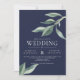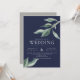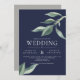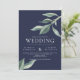 A stunning wedding invitation for couples looking for a clean modern look, featuring watercolor green leaves on a navybackground and white modern font. The backing is in solid grey but this can be removed.