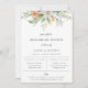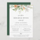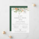 Elegant watercolor floral arrangement of ivory white, peachy orange and delicate green lilies and leaves, rehearsal dinner invitation. Chic and modern typography design. Back of card features solid dark emerald green colour.
