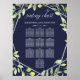 This elegant wedding seating chart features a modern, silver look geometric frame with a trendy green leaf-filled wreath on a midnight blue background.