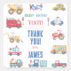 Cute boy's transport themed birthday thank you sticker featuring various vehicles and colorful text. This boy's transport 1st birthday thank you card could be used for any age.